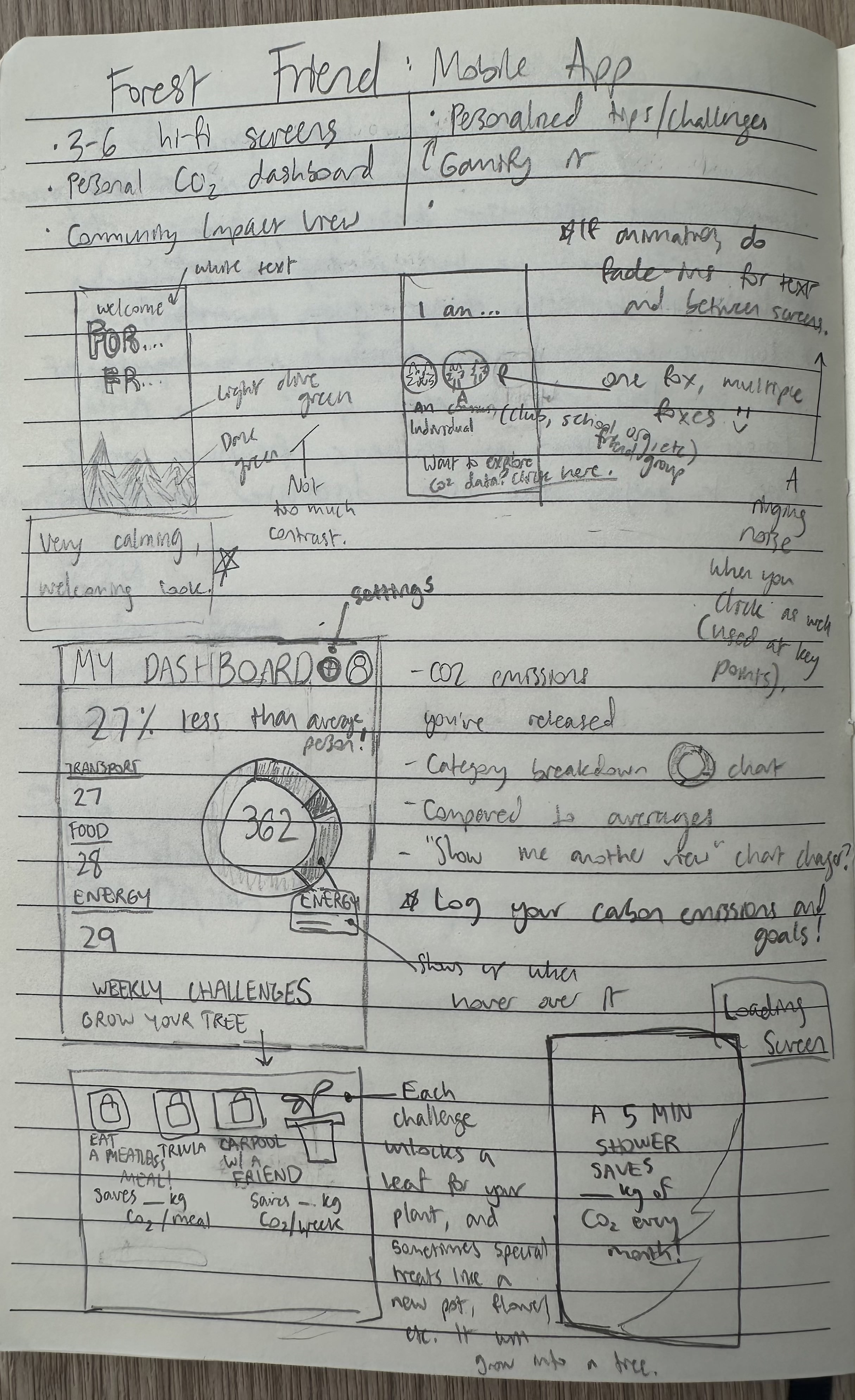 My vision for Forest Friend was an app that turns sustainable habits into leaves. Each time you complete an action, you earn a leaf and your tree grows a little more, until you have an entire forest.