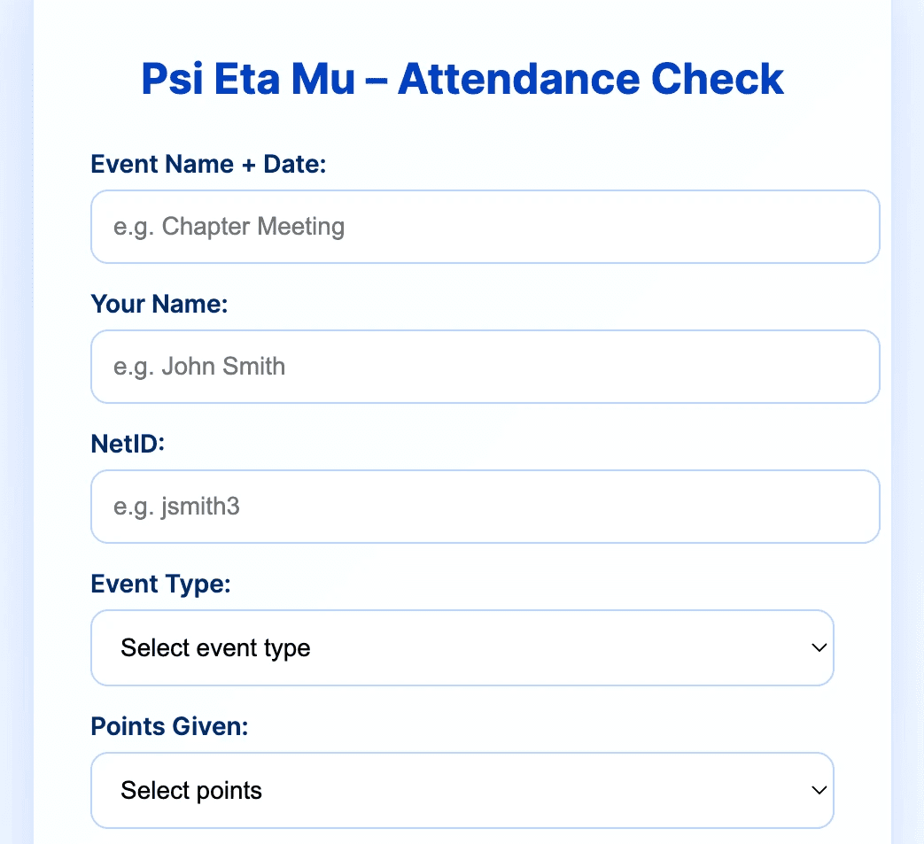 A 10-second form automates an attendance system for 200+ people. We redesigned attendance for Psi Eta Mu, a professional information science fraternity at UIUC. Our system is being implemented in spring 2026, so stay tuned for how it holds up.