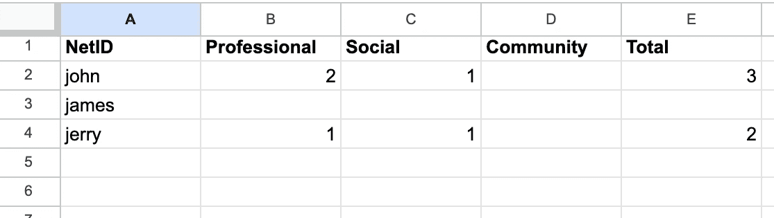 On our end, we have two connected spreadsheets to keep track of the entire organization's attendance.
